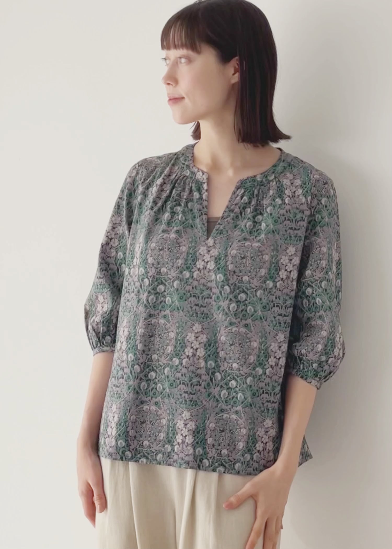 袖口と首元にギャザーの入った、キーネックのプルオーバーブラウス。袖は短めの七分丈、ストレートなシルエットのボディで、アウトにしてもバランスがとりやすい着丈です。