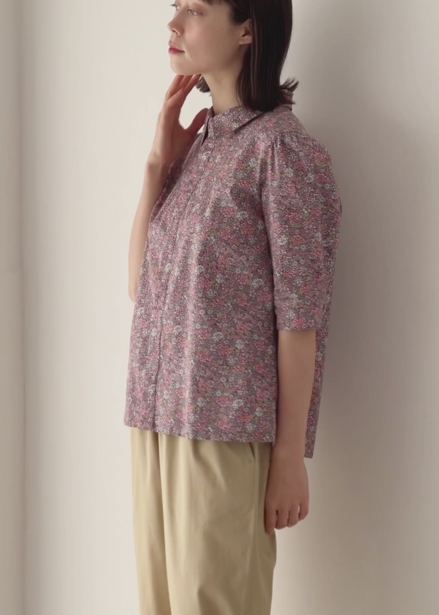 ややコンパクトなシルエットの、比翼仕立てのシャツ。控えめにギャザーを寄せた袖山やカフスのくるみボタンが、大人かわいらしい印象です。ひじまでの五分袖丈で上品な雰囲気に仕上げました。さまざまなボトムスに合わせやすい丈です。
