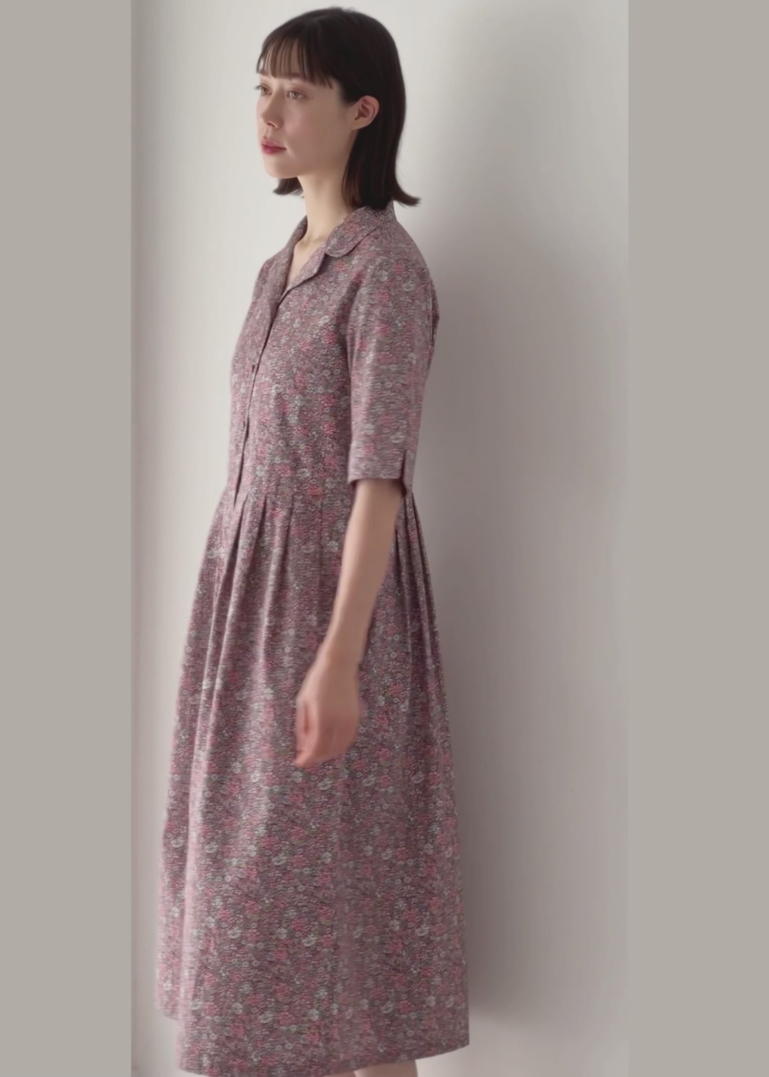 袖を折り返しやすくしているので、1枚でハーフ袖のワンピースとして着たり、ボタンを開けてコート風にも着ることができます。ゆったり着られるサイズ感のオープンカラーで、タートルネックのインナーも重ねやすく、長いシーズンお楽しみいただけます。