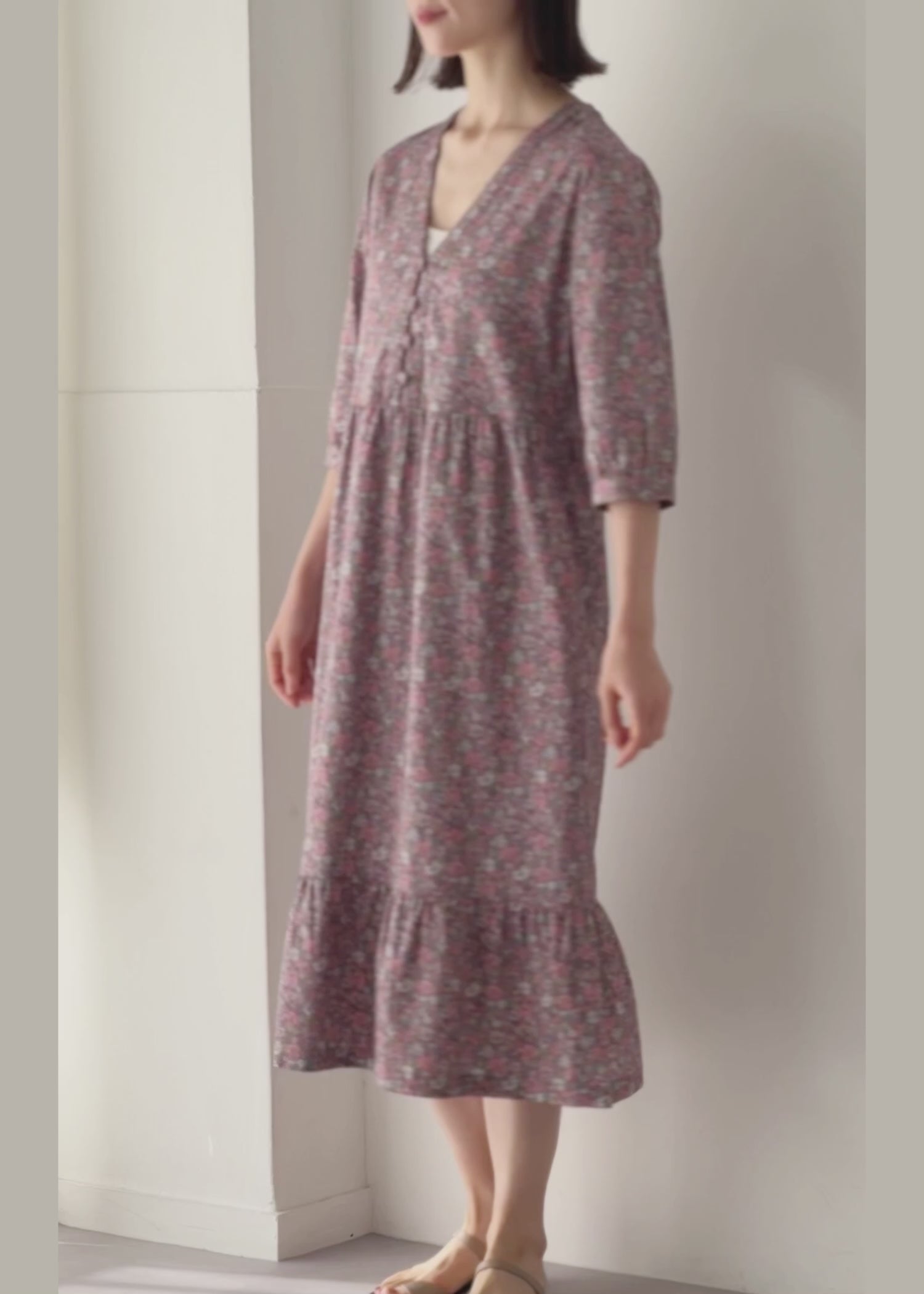 V&A オーガニックコットンサテンVネックワンピース フローラリア柄