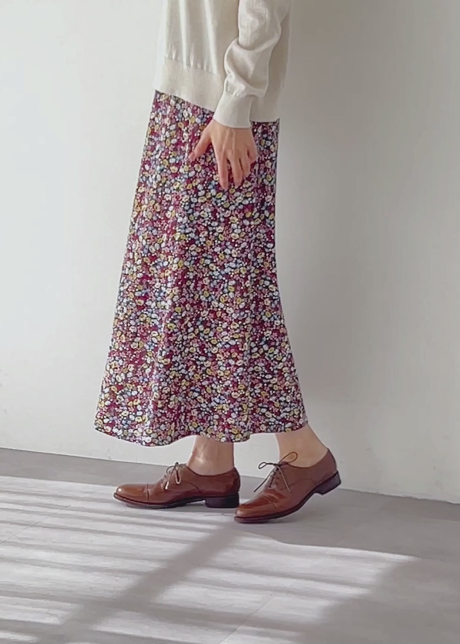裾に向かってフレアの入ったスカートです。ウエスはらくちんなゴム仕様ですが、ギャザー分量を抑えることで腰まわりをスッキリさせています。