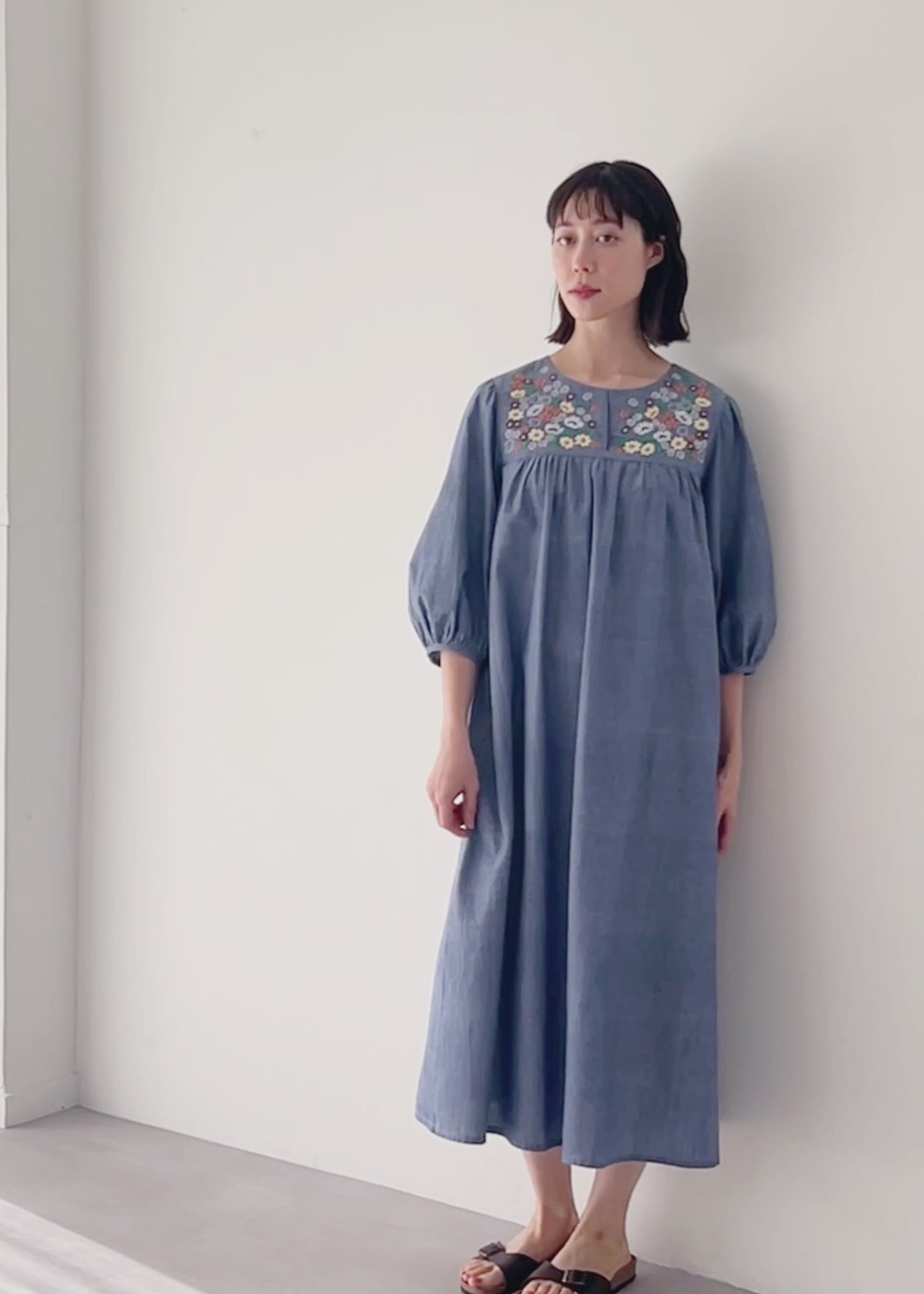 胸ヨークいっぱいに手刺繍をほどこした、たっぷりシルエットのロングワンピースです。刺繍を生かすため、前ボタンは内側についています。