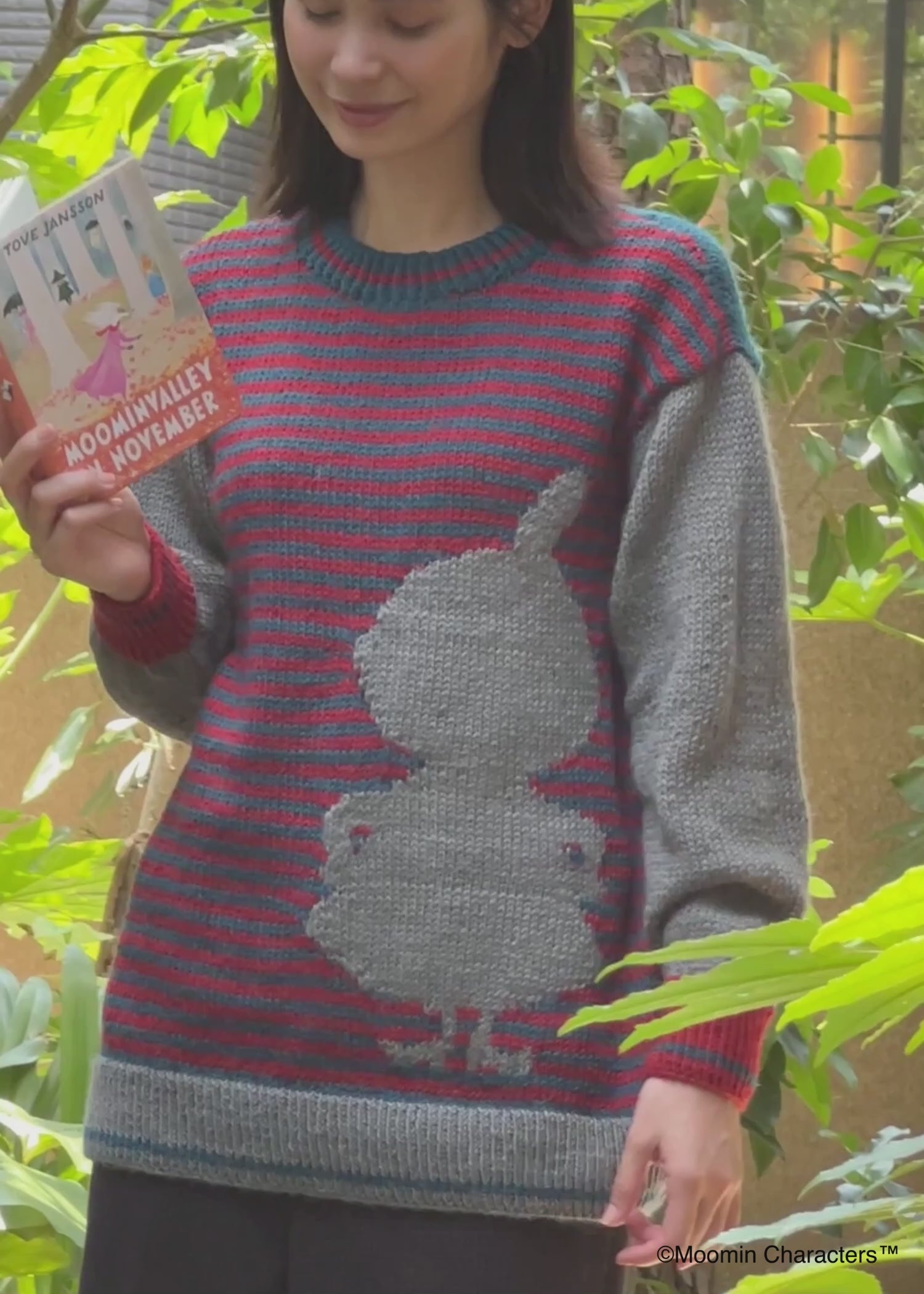 深いレッドとグレイのボーダーに、リトルミイのシルエットを大きく配した手編みのニットです。後ろ身頃はティールブルーの無地。カラーコントラストを楽しめる1枚です。