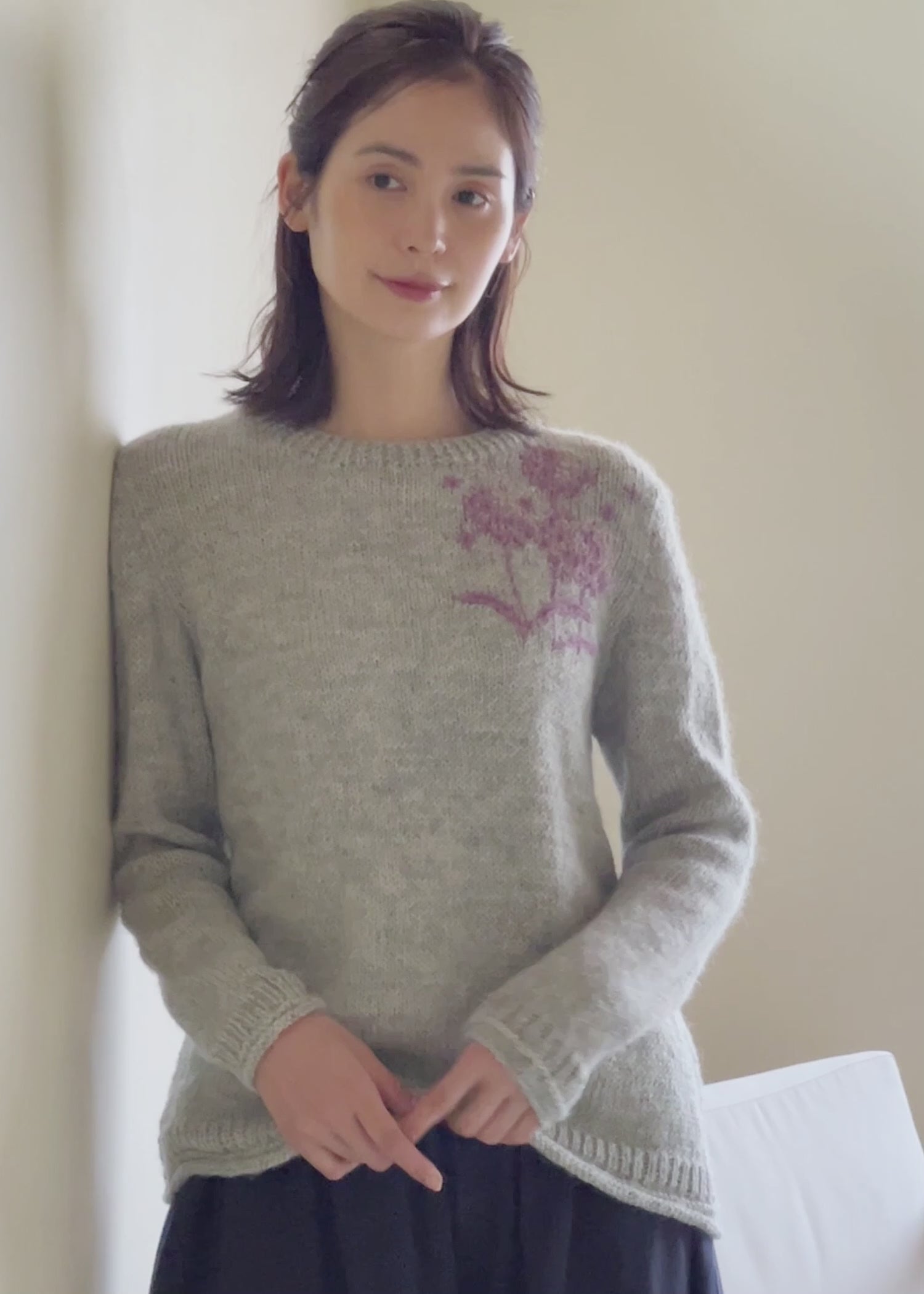 手編みのクルーネックプルオーバー。左胸に花模様をインターシャで編み込み、さらに濃淡の毛糸の手刺繍で茎や葉っぱをあしらいました。