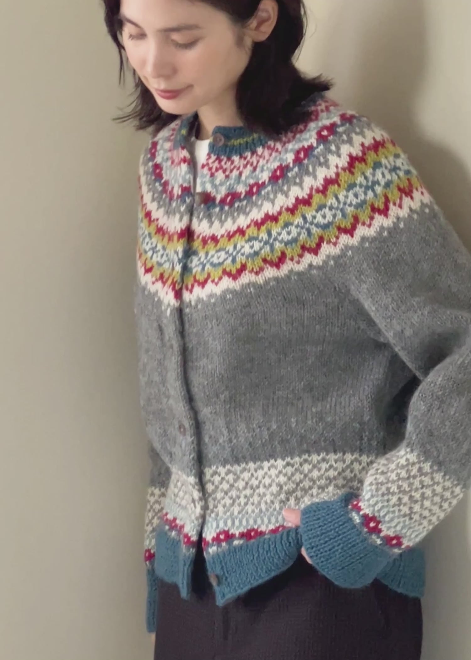 ヨークと裾、袖口にフェアアイル柄をあしらった手編みのカーディガンです。ベースはグレイで落ち着いていますが、色数の多い柄が華やかな印象。インナーやボトムスの色合わせも楽しめそう。